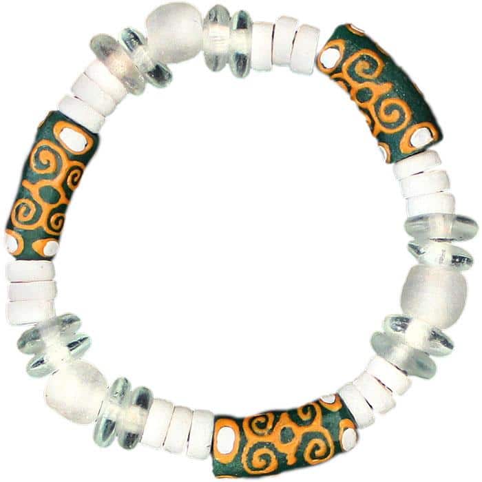 Global Mamas’ beads are made from recycled glass. Due to each piece’s individuality, all sizes and lengths are approximate. Bracelets have clear elastic band. Includes tag explaining the meaning of the Ram’s Horn Adinkra symbol: Strength & Humility. (~7.5″)