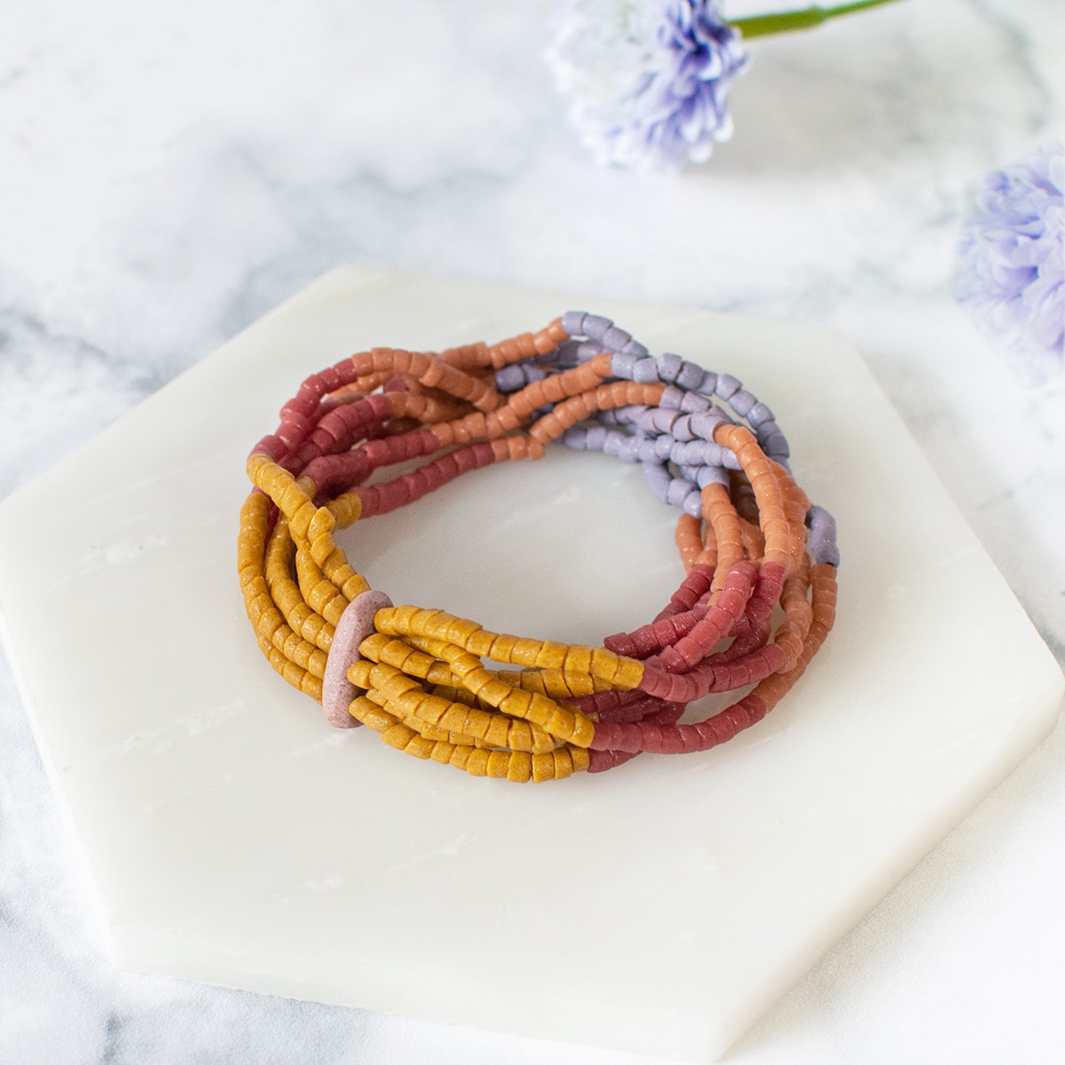 Global Mamas’ beads are made from recycled glass. Due to each piece’s individuality, all sizes and lengths are approximate. Bracelets have clear elastic band. (~8″)