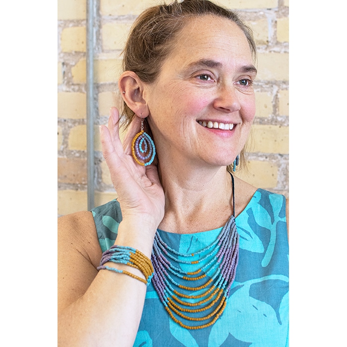 Global Mamas’ beads are made from recycled glass. Bead at back allows for adjustable length.