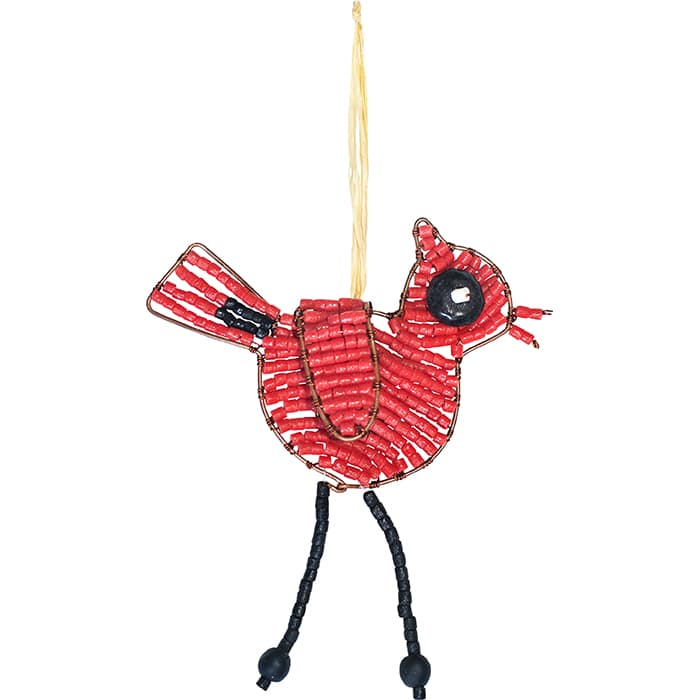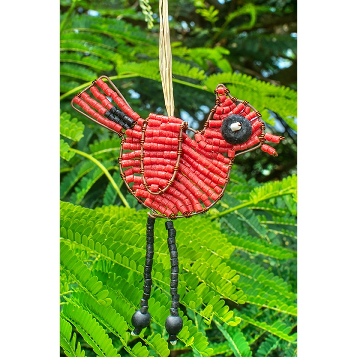 Beads made from recycled glass. Wire framework and loop for hanging. ~5” tall with 2” raffia loop.