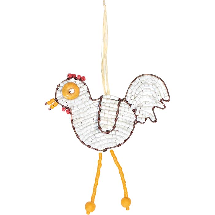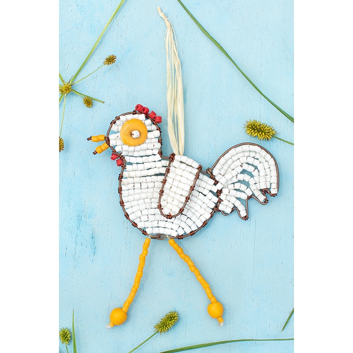 Beads made from recycled glass. Wire framework and loop for hanging. ~5” tall with 2” raffia loop.