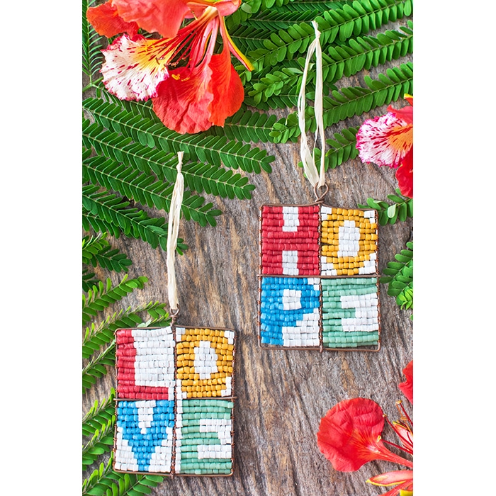 Beads made from recycled glass. Wire framework and loop for hanging. ~3” tall with 2” raffia loop.