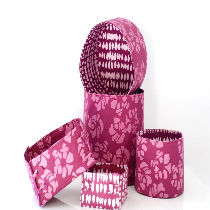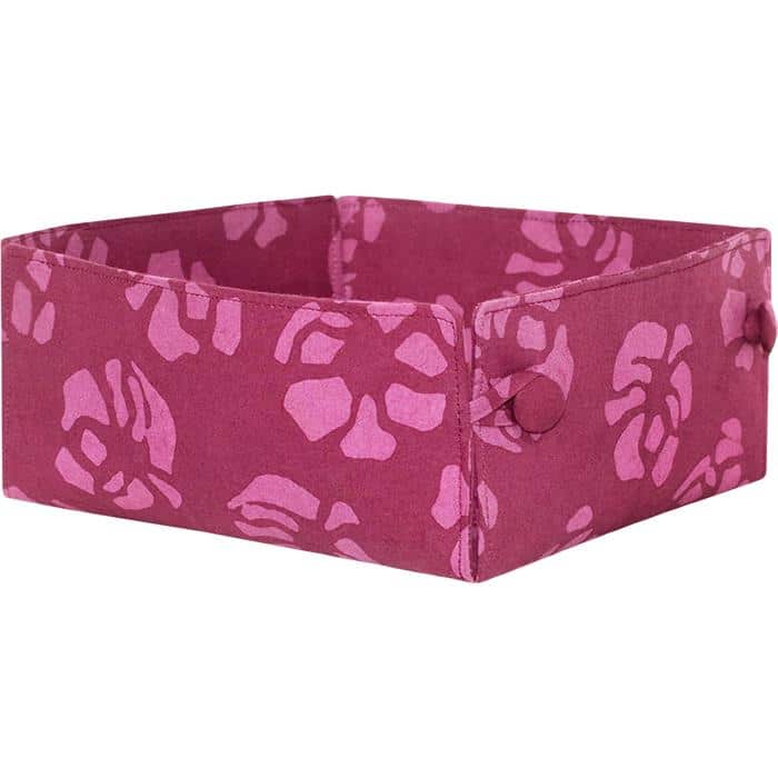 Four sides fold up and button together. Reinforced to hold shape. 7.5” x 7.5” x 4” assembled. 100% organic cotton shell.