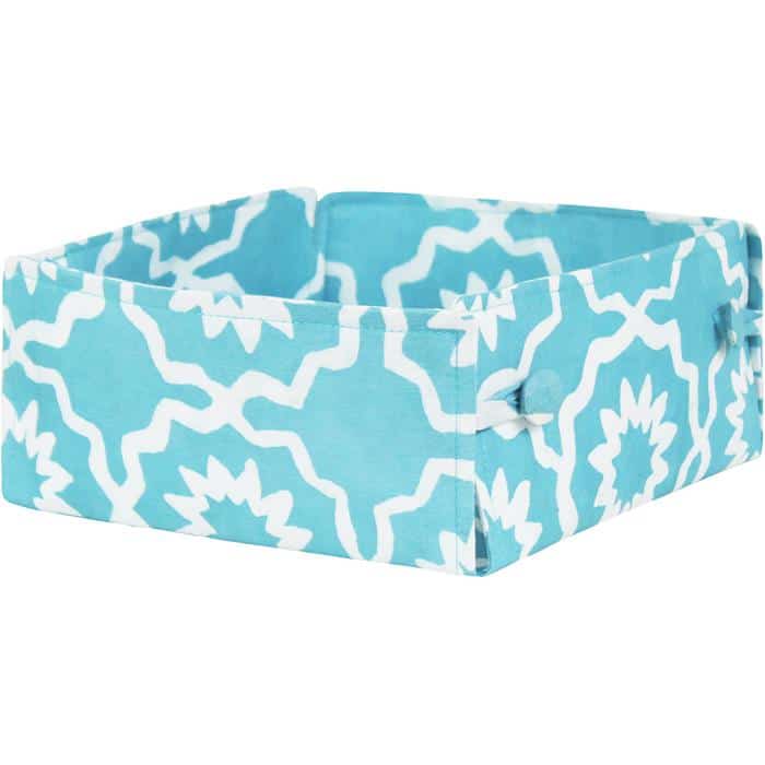 Four sides fold up and button together. Reinforced to hold shape. 7.5” x 7.5” x 4” assembled. 100% organic cotton shell.