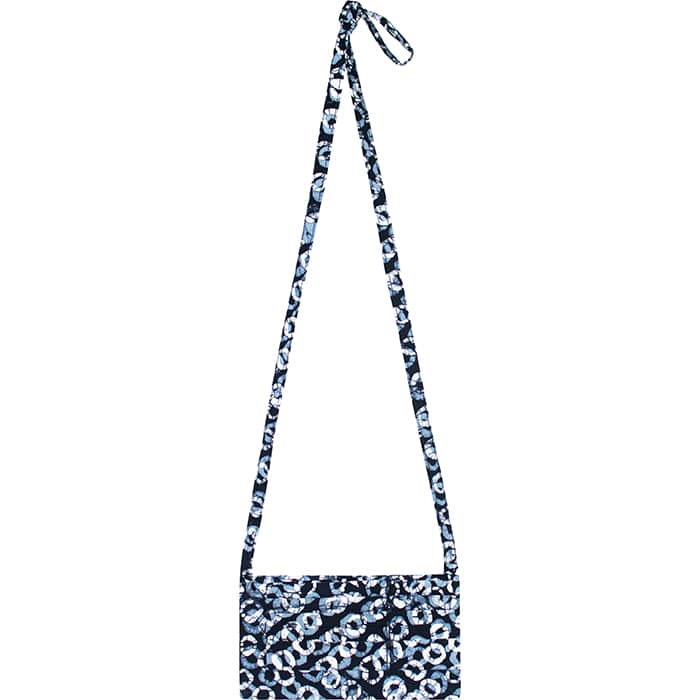 Pleated front. Snap closure. Inside has four card size pockets and one larger pocket. 4.5″H x 7.5″W. Optional strap tucks in when not in use. 23″ handle drop. 100% organic cotton shell.