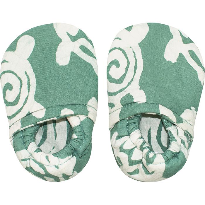 Batik shell and lining. Padded with foam. Elastic around ankle. 100% organic cotton.