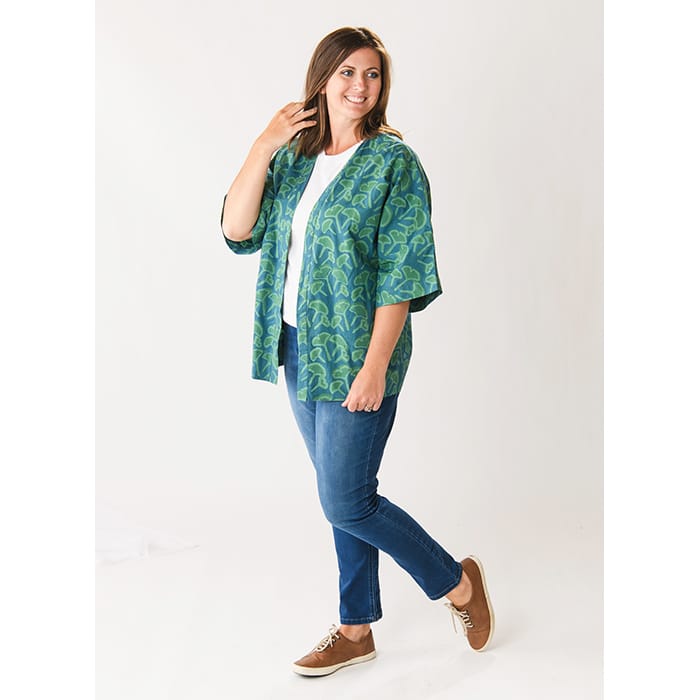 Easy fit. Full wrap front with removable belt. Elbow length sleeves. Hip length 100% organic cotton.