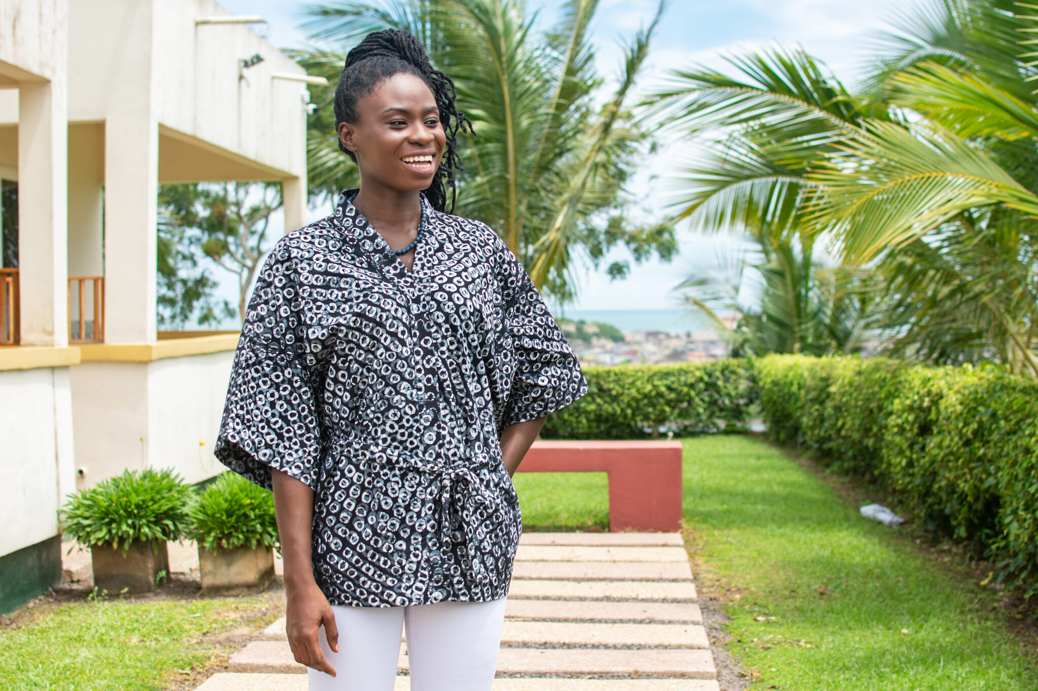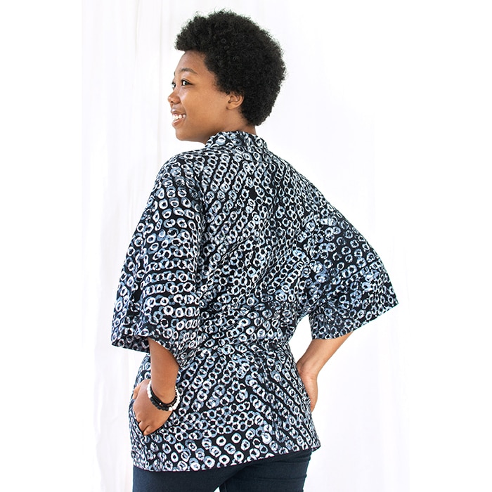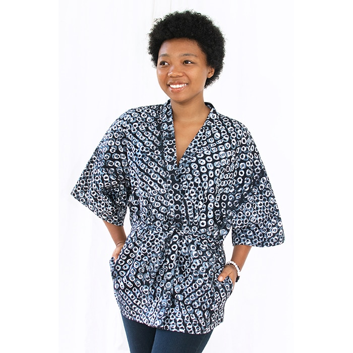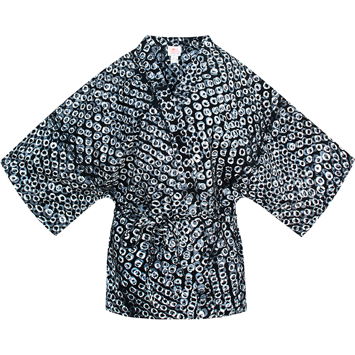 Easy fit. Full wrap front with removable belt. Elbow length sleeves. Hip length 100% organic cotton.