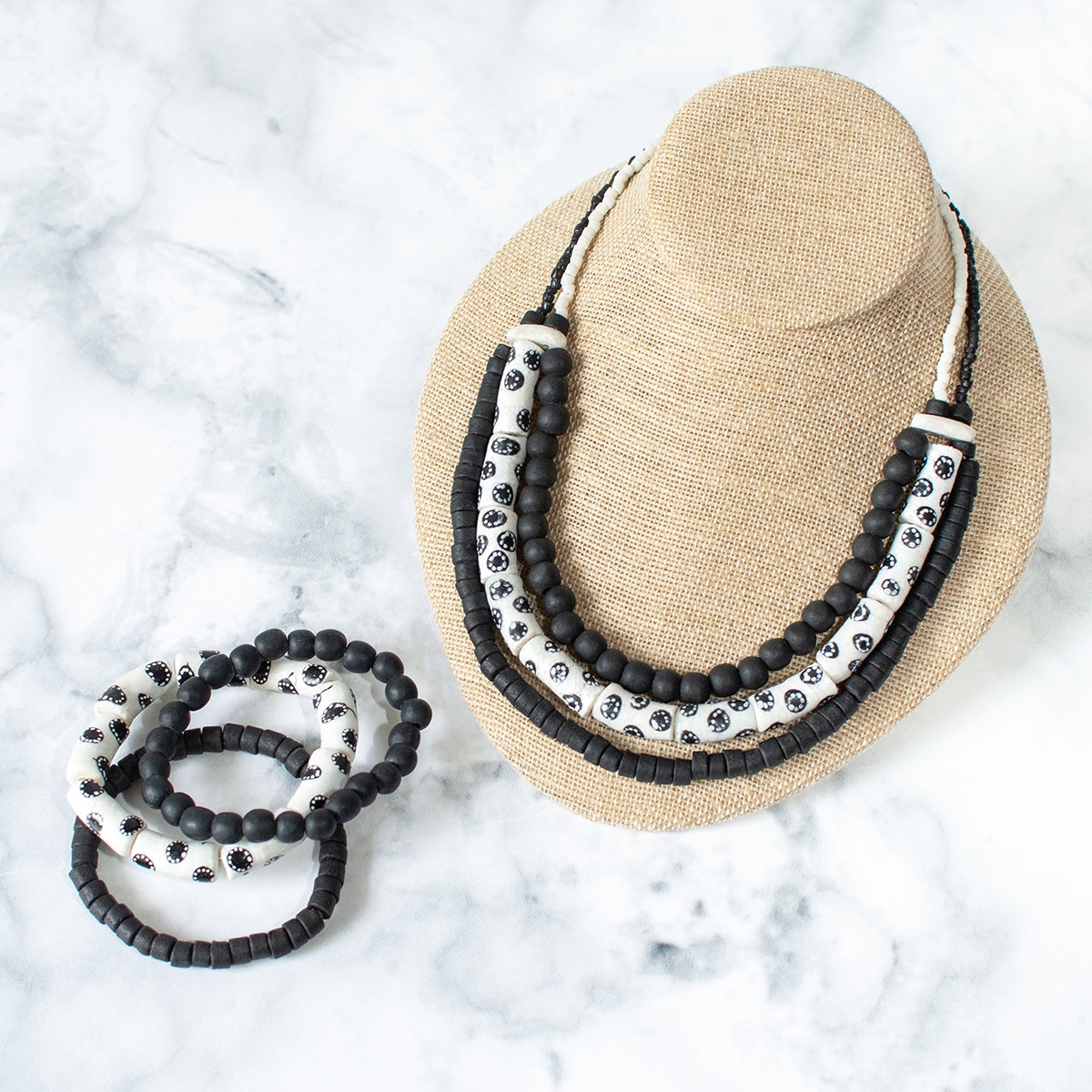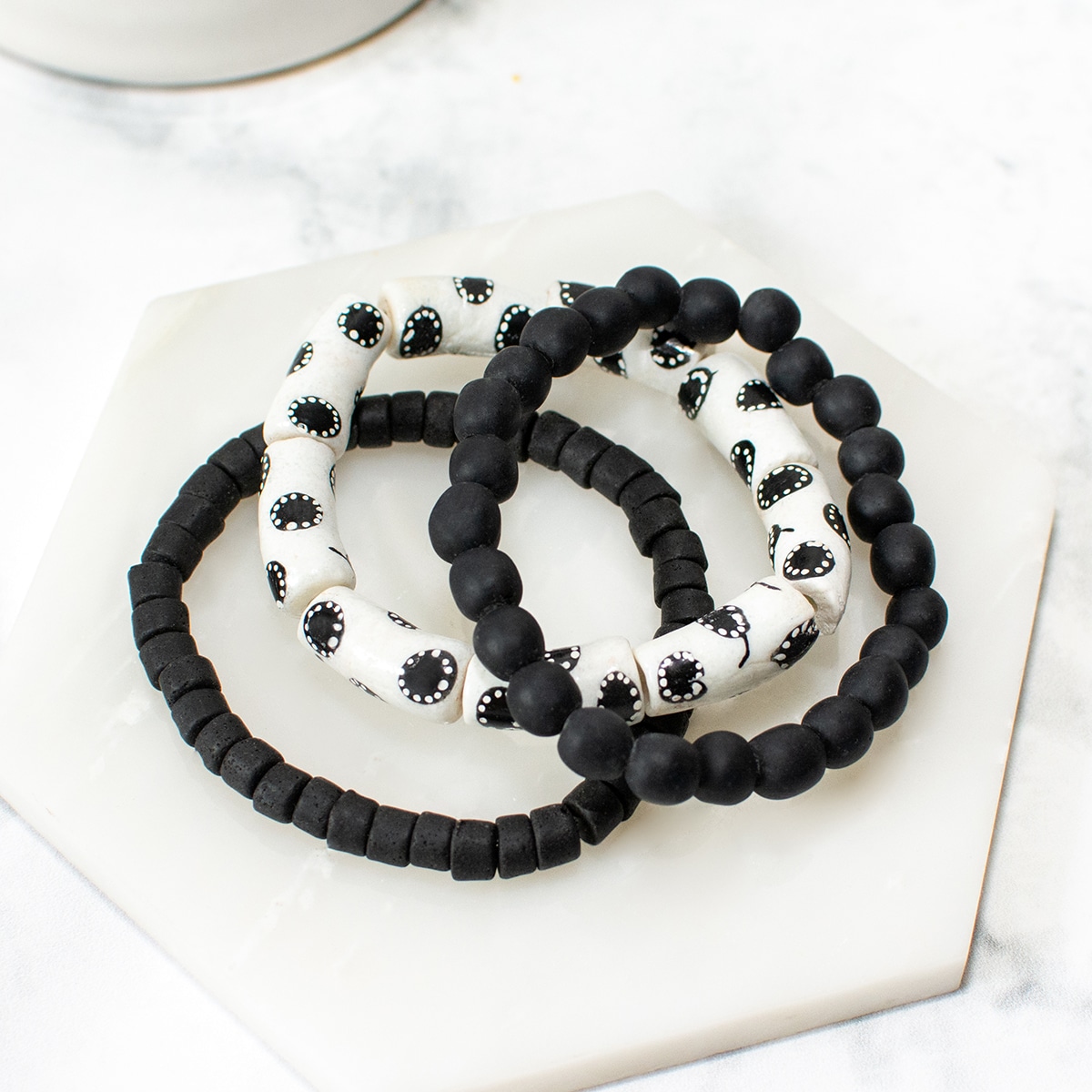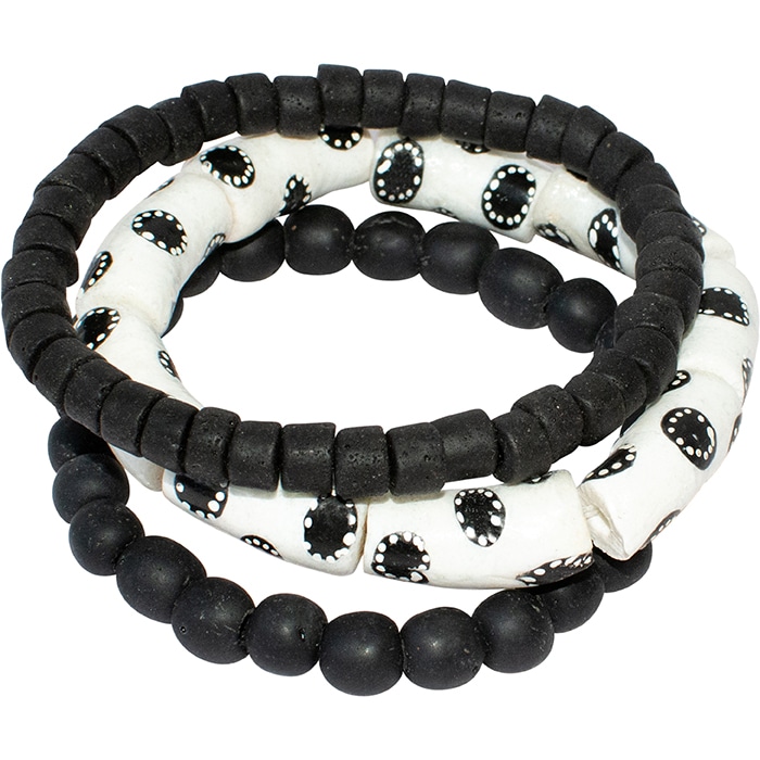 Manye means Queen Mother in the Krobo dialect. Global Mamas’ beads are made from recycled glass. Due to each piece’s individuality, all sizes and lengths are approximate. Bracelets have clear elastic band. (~8″ x 3)