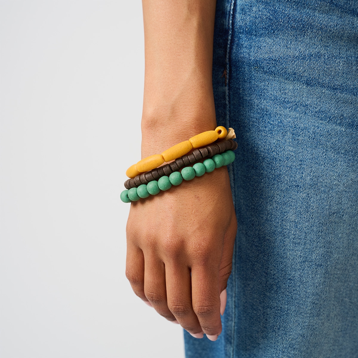 Manye means Queen Mother in the Krobo dialect. Global Mamas’ beads are made from recycled glass. Due to each piece’s individuality, all sizes and lengths are approximate. Bracelets have clear elastic band. (~8″ x 3)