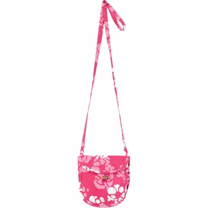 Flap cover. Loop closure with hand-made African bead ?button?. Inside partition. 23? handle drop. 6?H x 5.5?W x 2?D. Upcycled flour sack lining. 100% organic cotton.