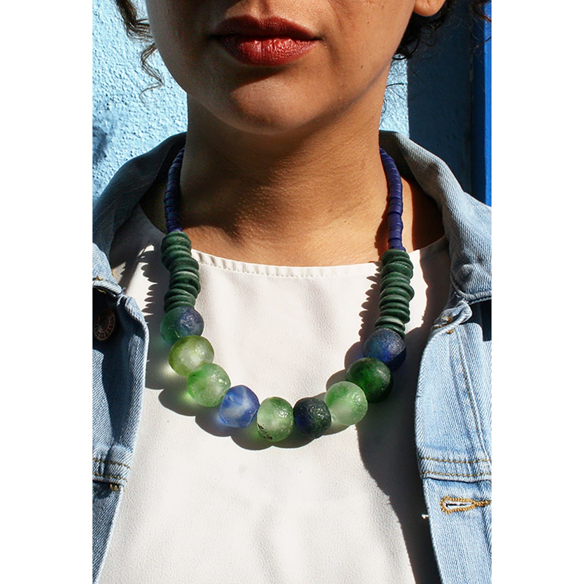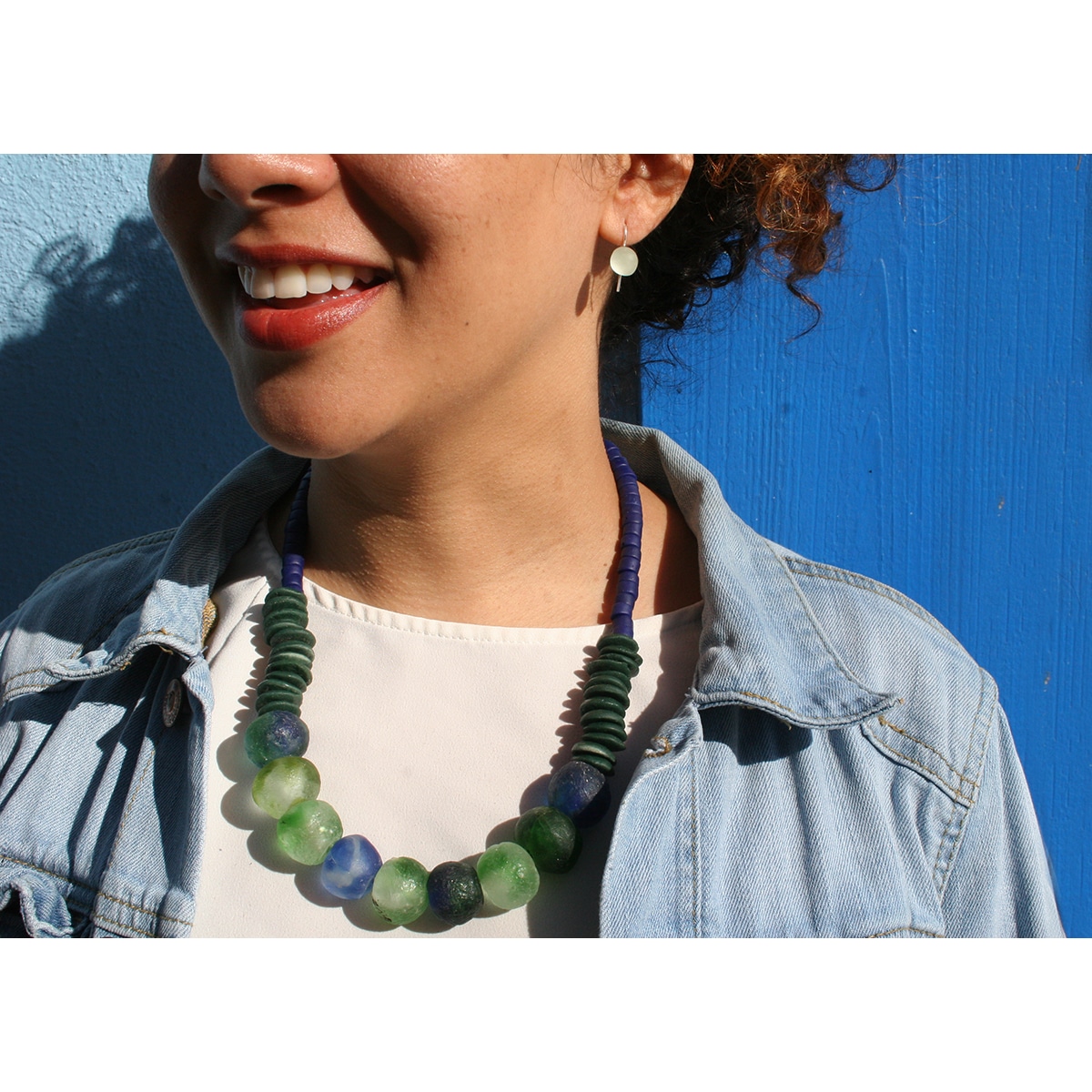 Global Mamas’ beads are made from recycled glass. Due to each piece’s individuality, all sizes and lengths are approximate. Necklace findings are silver plated. (~21″)