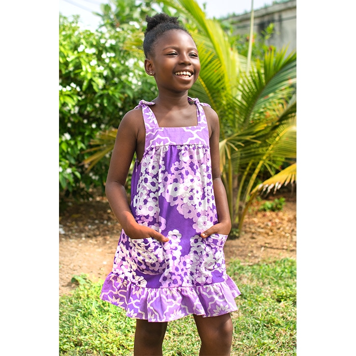 Adjustable tie straps. Contrast yoke and ruffle. Two front pockets. 100% organic cotton.