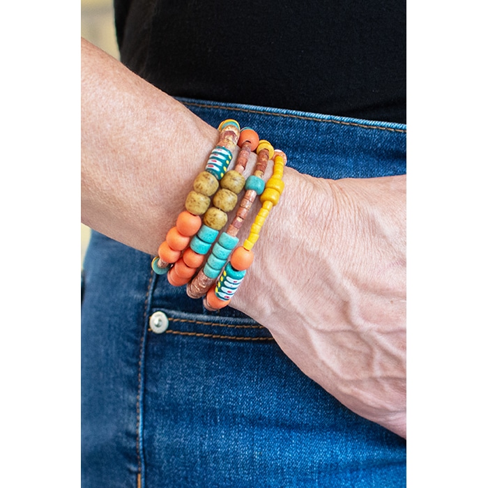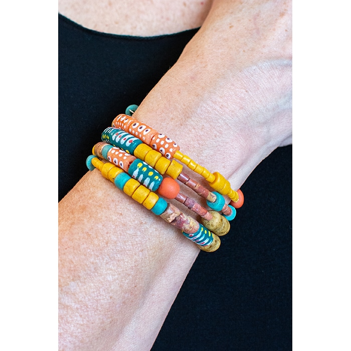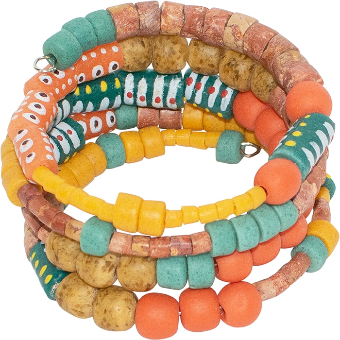 Global Mamas’ beads are made from recycled glass. Due to each piece’s individuality, all sizes and lengths are approximate. Memory wire forms spiral around wrist. (~23″ in 3 coils)