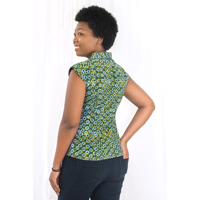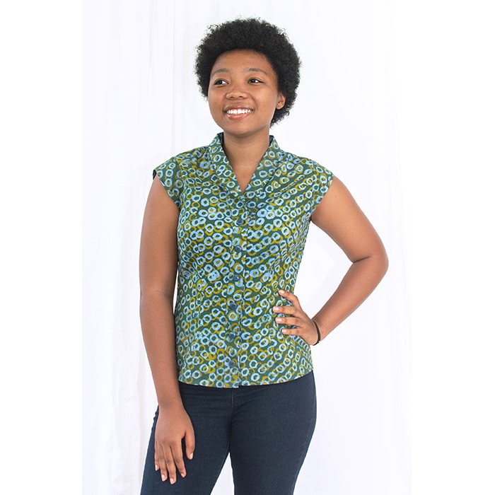 Fitted body. V-neck. Band collar. Cap sleeves. Button front with fair trade, Tagua nut buttons. 100% organic cotton.