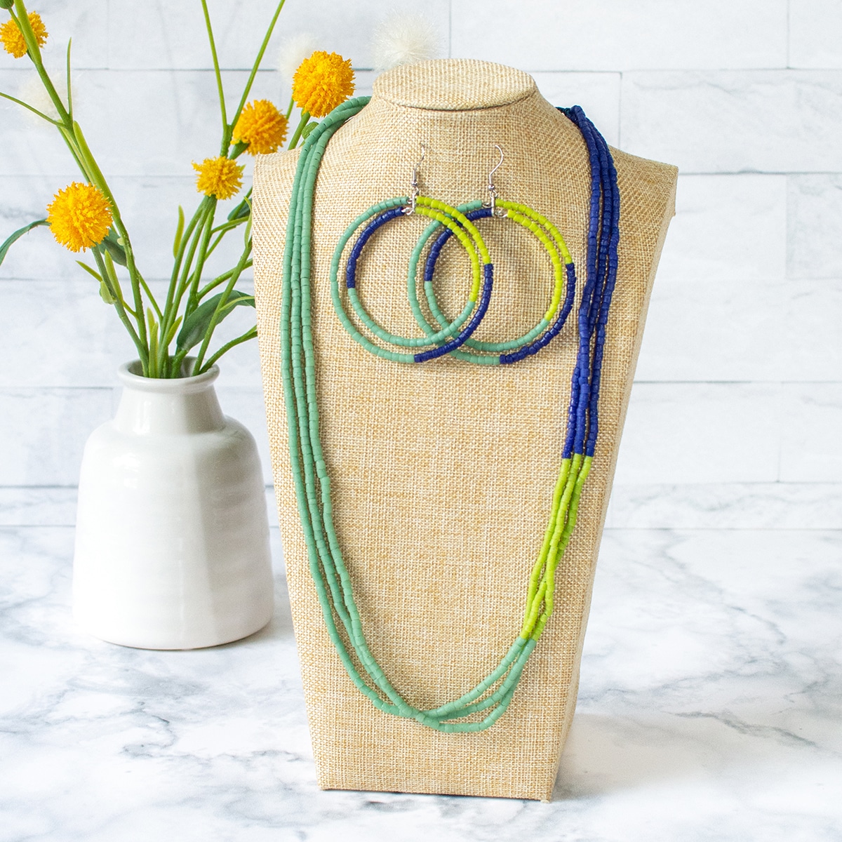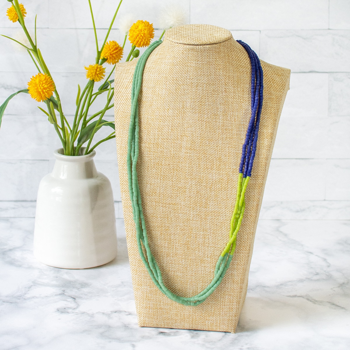 Global Mamas’ beads are made from recycled glass. Due to each piece’s individuality, all sizes and lengths are approximate. Necklace strung on braided thread cord.
