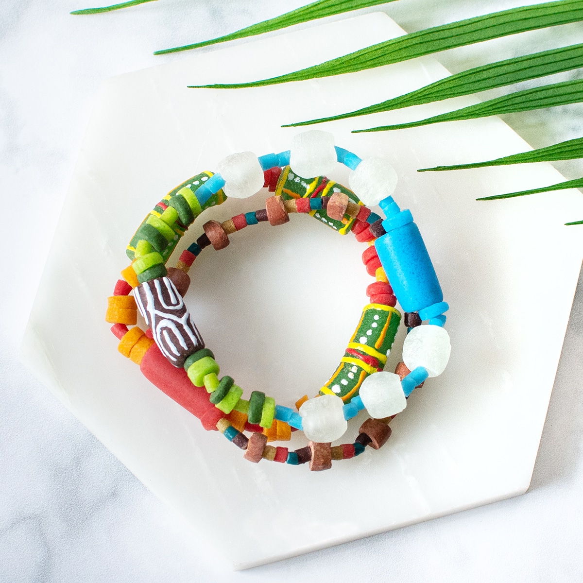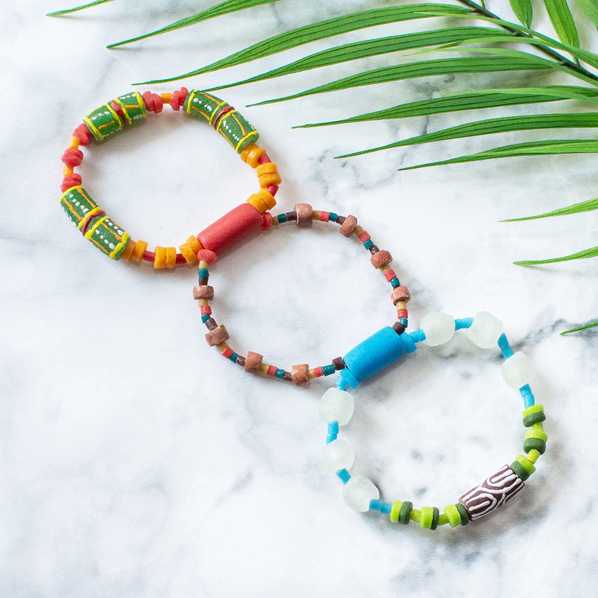 Global Mamas’ beads are made from recycled glass and bauxite stone. Due to each piece’s individuality, all sizes and lengths are approximate. Bracelet has three connected bands representing aspects of fair trade at Global Mamas: Prosperity, African Women & their Families, and Healthy Environment. Strung on clear elastic band. (~7.5″ x 3). Includes tag that reads: This bracelet represents the power of fair trade, which at Global Mamas results in prosperity for African women and their families, while ensuring a clean and healthy environment for future generations.